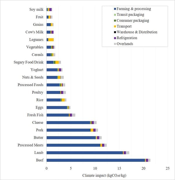 The climate impact of different foods is largely determined by the on-farm stage of production. Other lifecycle stages such as processing, packaging, and transportation play a much smaller role.