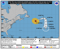 As of 10 a.m., the center of the storm was about 450 miles east of Cape Race, Newfoundland.