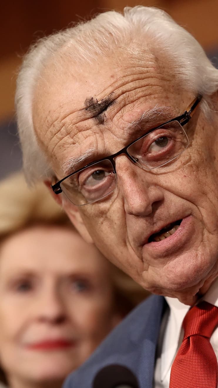 Sen. Debbie Stabenow of Michigan looks on as Rep. Bill Pascrell of New Jersey, with Ash Wednesday ashes on his forehead, speaks during a 2017 press conference at the Capitol.